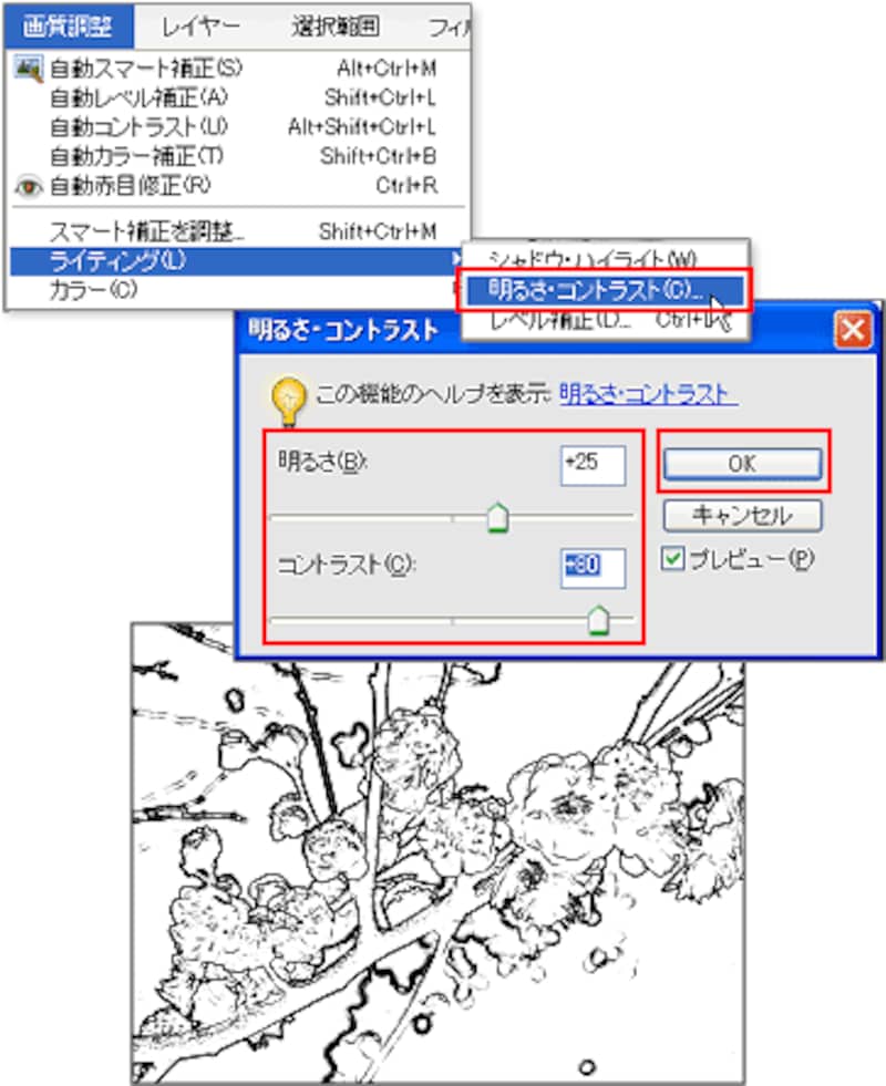 [画質調整]メニュー→[ライティング]→[明るさ・コントラスト]を選びます。線がはっきりして、細かい点が目立たなくなるように、[明るさ]と[コントラスト]のスライダをドラッグして調整します。ここでは明るさは控えめにしておき、コントラストを強めにしておき、次の行程で濃さを調整します。[OK]をクリックして確定します。