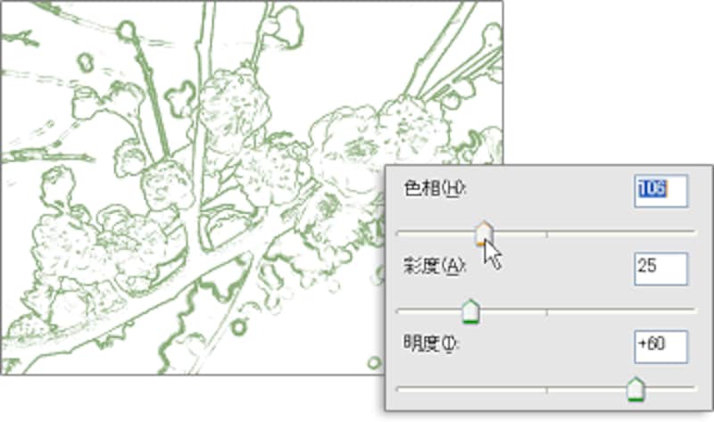 3. [色相]のスライダをドラッグして、好みの色にします。[彩度]で鮮やかさを調整します。[明度]で線の濃さ、薄さを調整します。