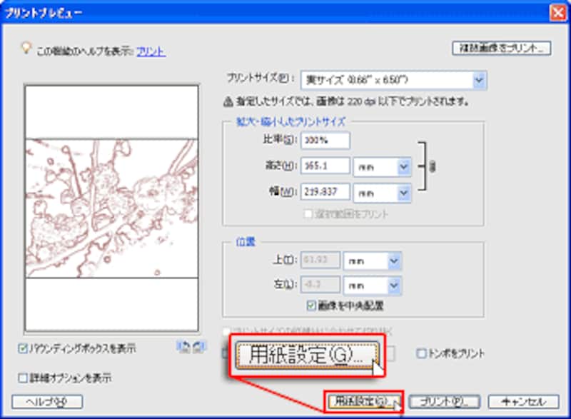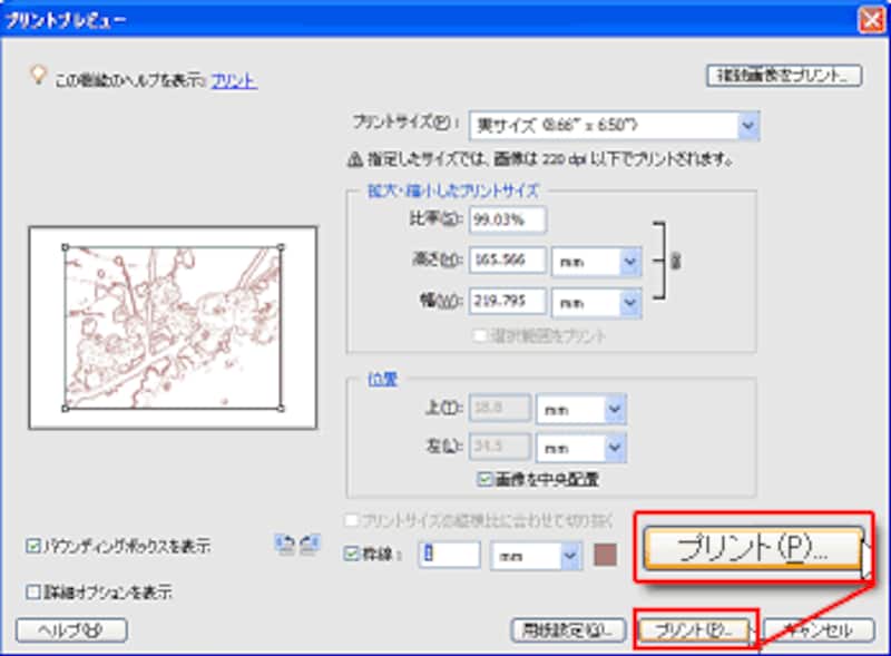 [プリントプレビュー]画面で[プリントサイズ]を設定します。ここでは「実サイズ」にしていますが、必要に応じて、[プリントサイズ]を[カスタム]にして[バウンディングボックスの表示]にチェックを入れ、バウンディングボックスの枠をドラッグして大きさを調整します。