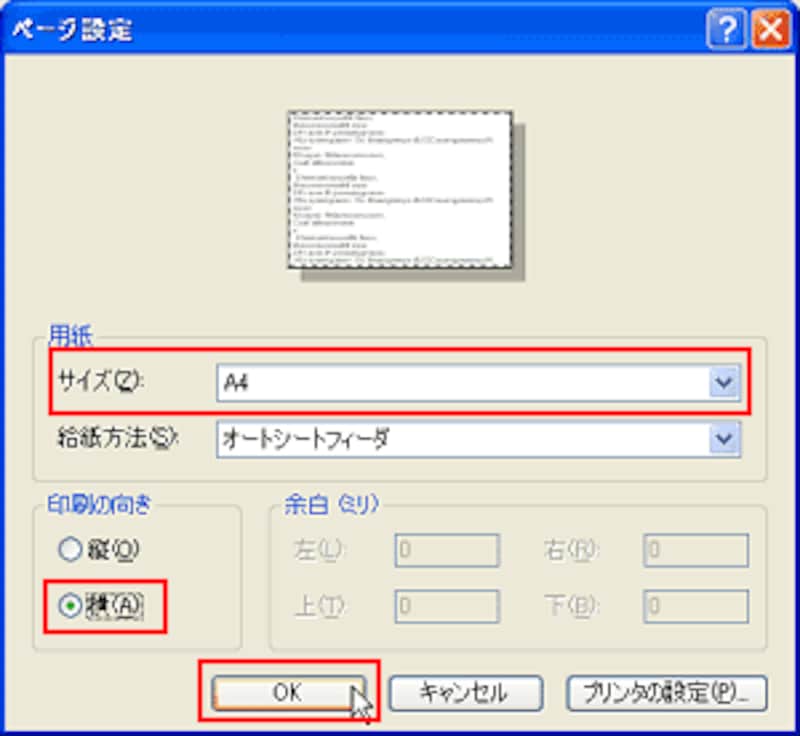 ▲[サイズ]を「A4」に、「印刷の向き]を「横」に設定して、[OK]をクリックします
