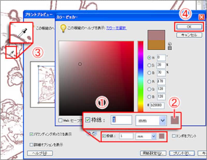 再び[プリントプレビュー]に戻ります。ここでは1mm幅の枠線を付けて印刷します。