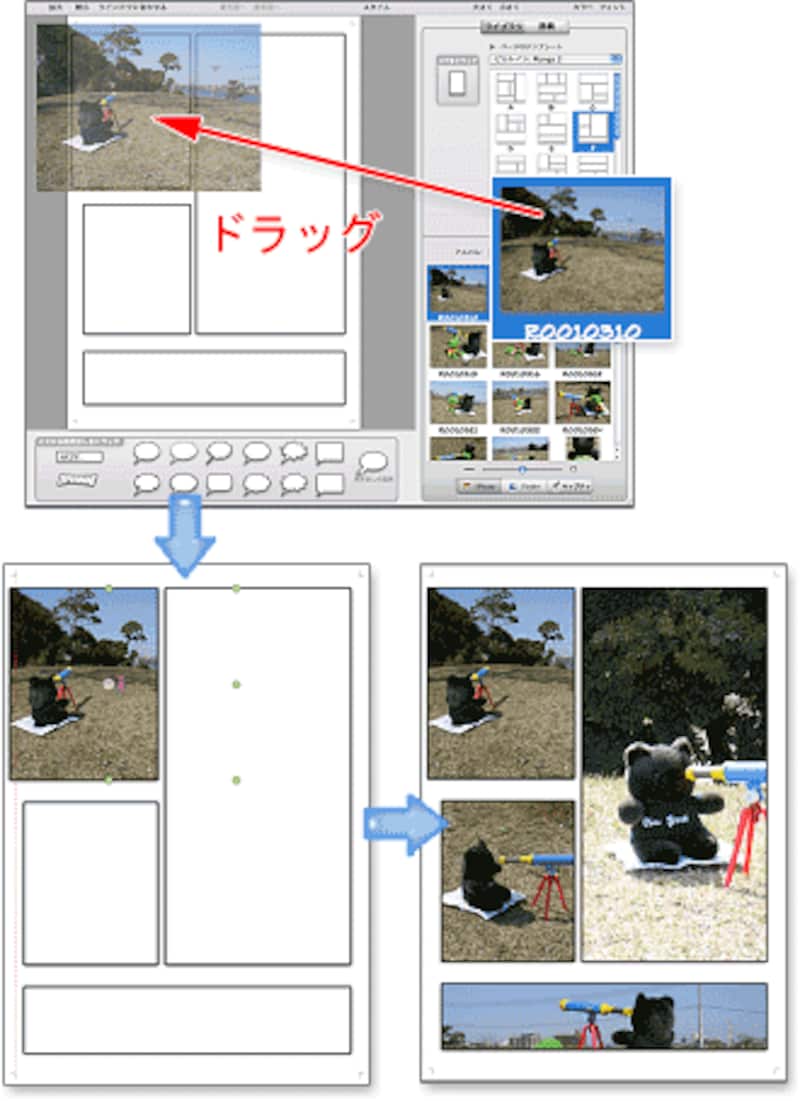 | iPhotoのアルバムを指定して、サムネールをコマに直接ドラッグ。自動的に枠に合わせて写真が入り込む。コミックは左上のコマから開始 |