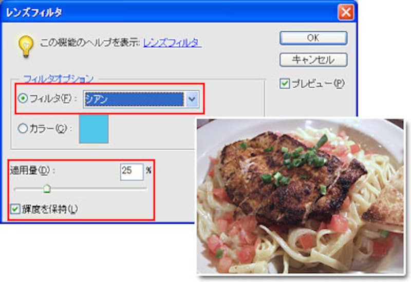 [フィルタ]を選択して[シアン]に設定します。[輝度を保持]にチェックを入れて、[適用量]のスライダーをドラッグして調整します。すると、皿の色が本来の白に近くなります。[OK]をクリックして確定します。