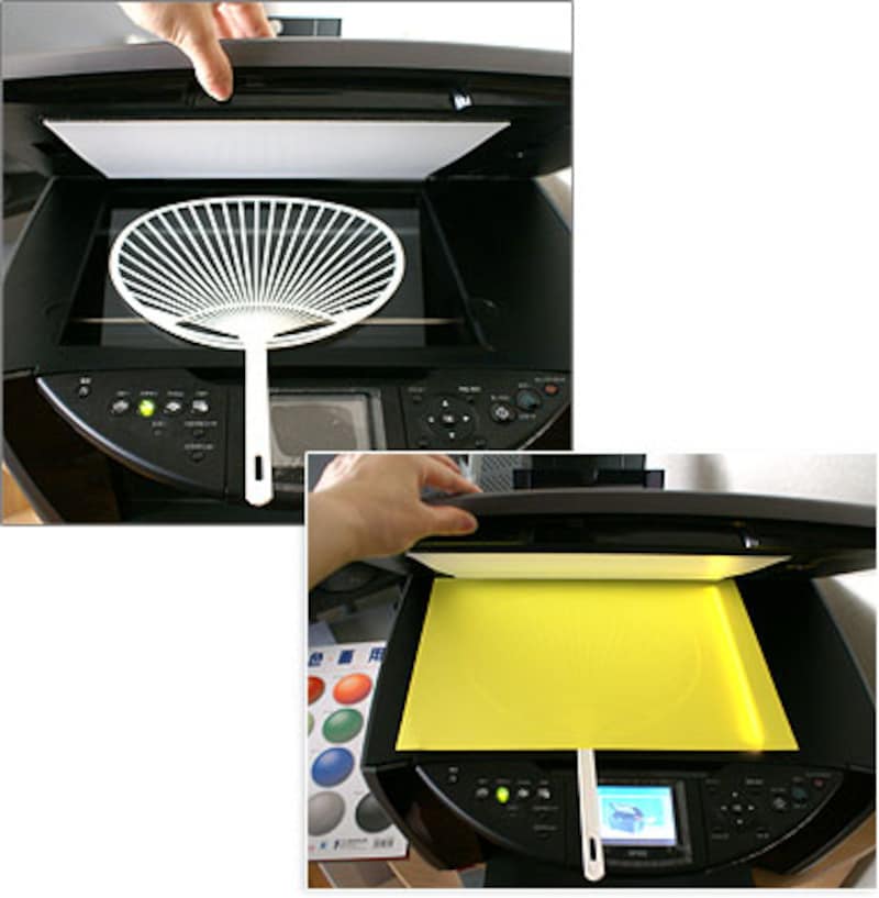 うちわの骨をスキャナにセットします。続けて白以外の用紙があれば、骨の上にかぶせると、後で形を自動的に検出しやすくなります。