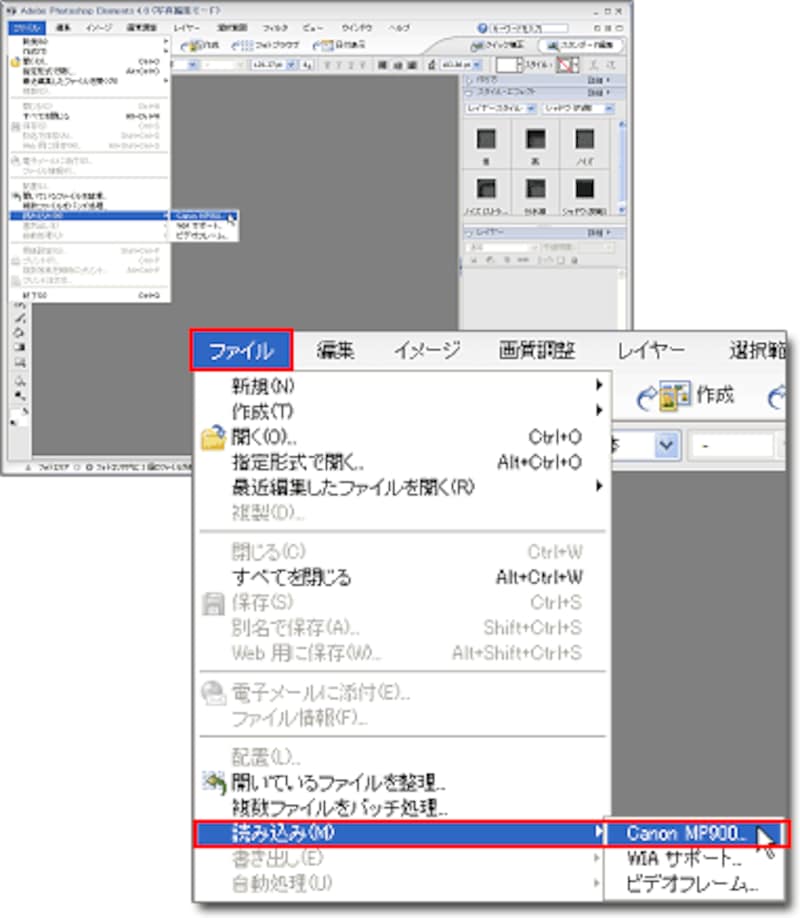 次にPhotoshop Elementsを起動します。[ファイル]メニュー→[読み込み]から、パソコンに正しく接続しているスキャナを選択します。