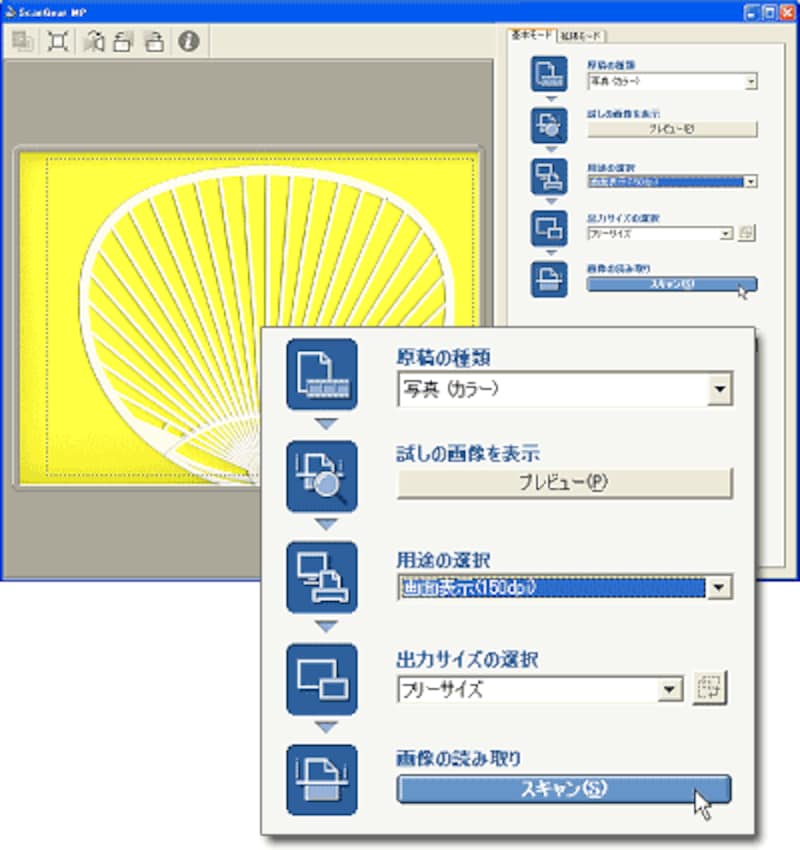 スキャナのユーティリティソフトが起動します。お使いの機種によって操作画面が異なりますが、[カラー(写真)]で試しの読み込み(プレビュー)を実行後、解像度を150dpi程度に設定して、本番の読み込み(スキャン)を実行します。