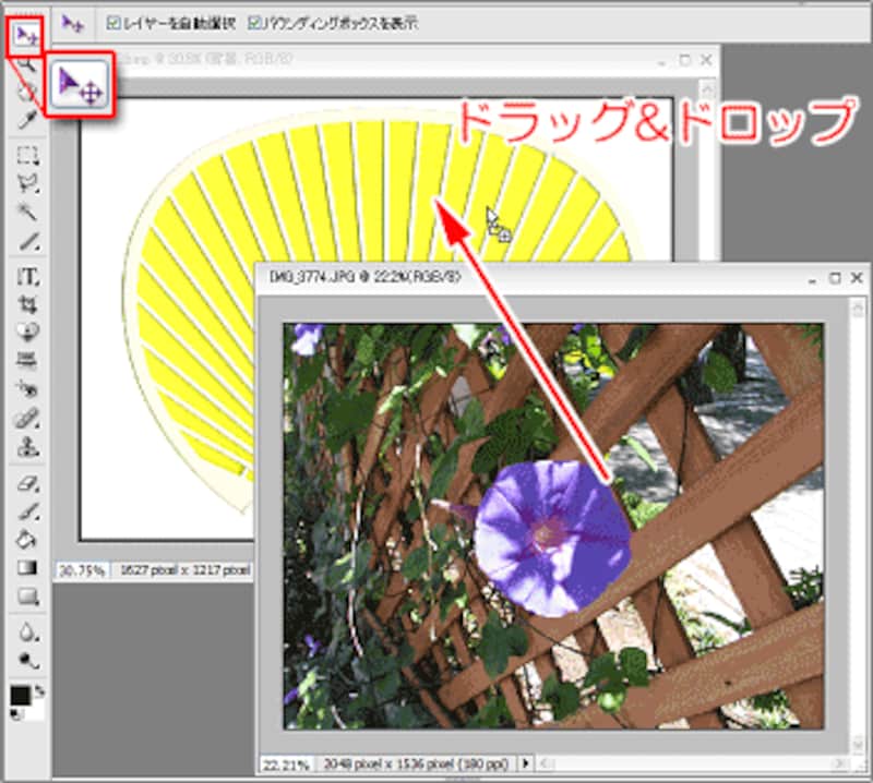貼り付け用の写真を開きます。[移動ツール]を選び、写真をうちわの画像へとドラッグ&ドロップします。
