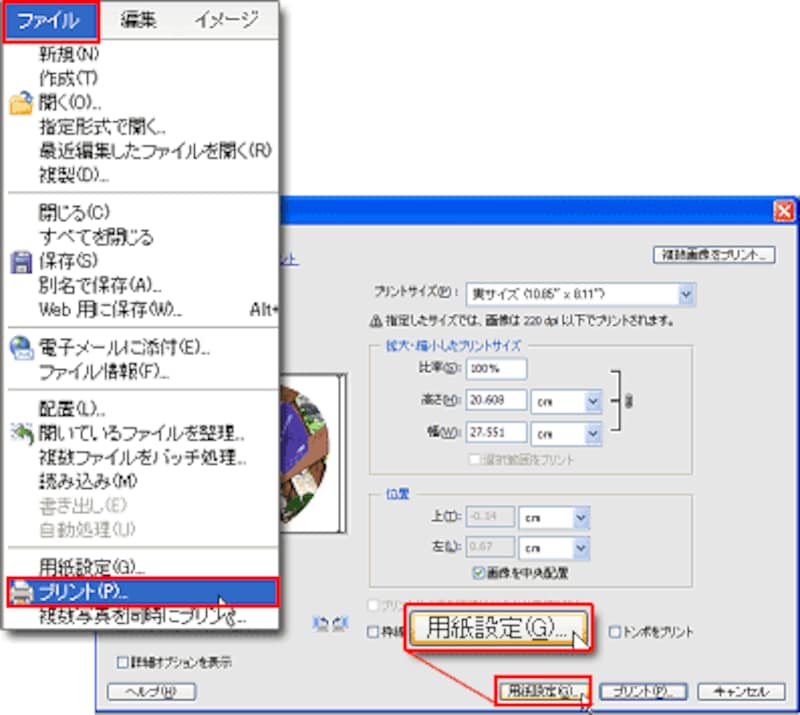 [ファイル]メニュー→[プリント]を選び、[プリントプレビュー]ダイアログボックスで[用紙設定]をクリックします。