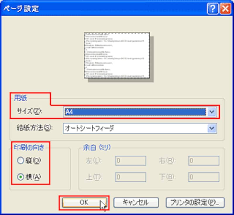 [用紙]の[サイズ]を「A4」に、[印刷の向き]を「横」に設定して、[OK]をクリックします。