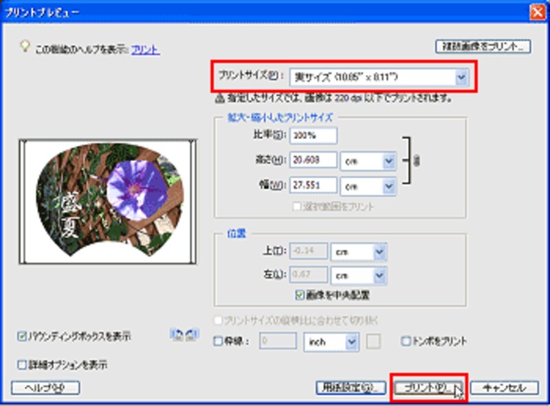 再び[プリントプレビュー]ダイアログボックスで[プリントサイズ]を「実サイズ]に設定します。プリンタに用紙をセットして、[プリント]をクリックします。