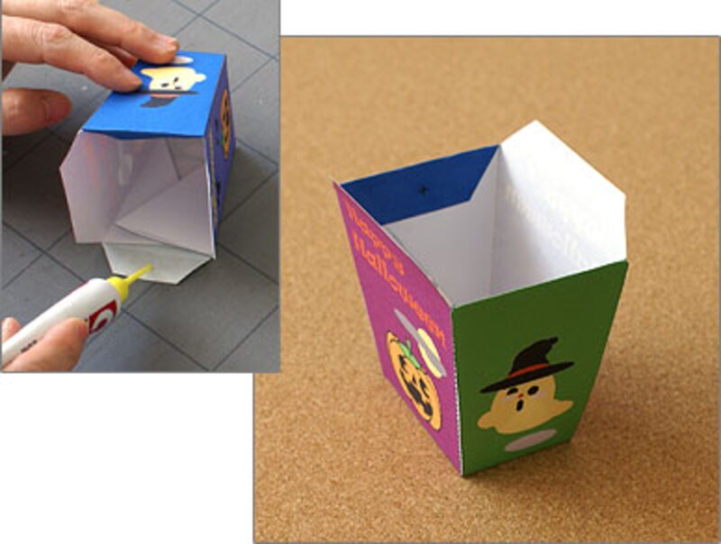 | 小さい方の側面の上部、+印の付いている部分を内側に折りってかぶせます。 |