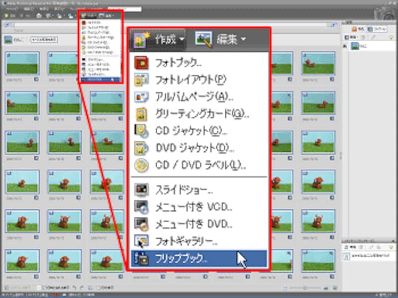 コレクション内の全写真を選択した状態で[作成]→[フリップブック]を選びます。