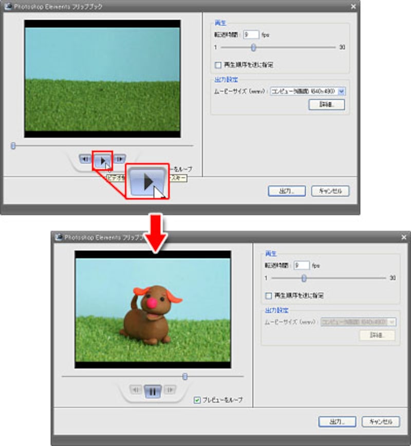 あとは、[フリップブック]ダイアログの[再生]をクリックするだけで、自動的にパラパラ漫画が再生されます。まるで生きているように動くので、感動してしまいます。