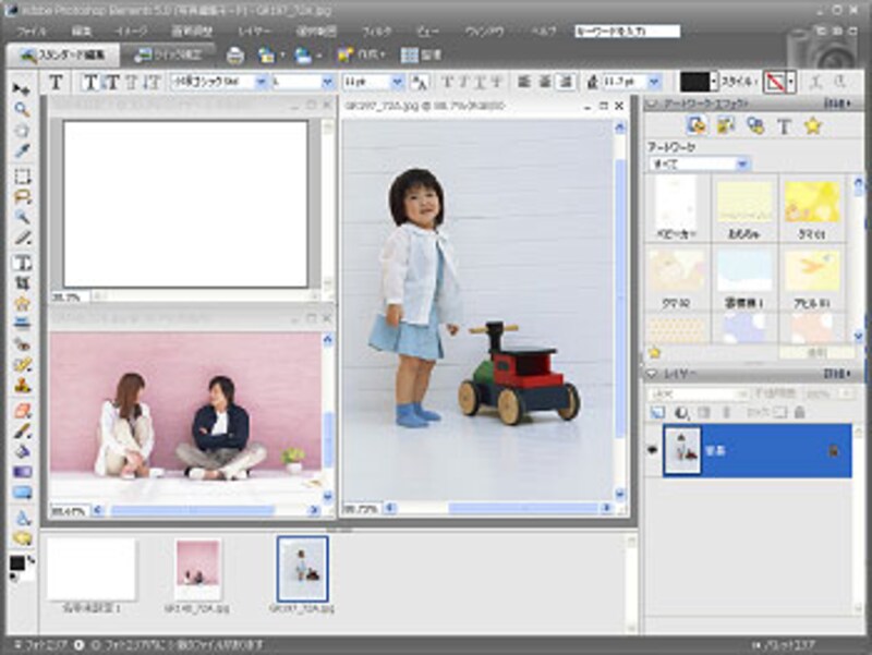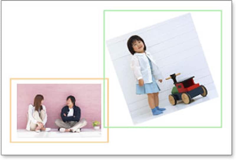 お子さんと親の写真をそれぞれ配置した上に、色の枠を重ねて交わらせることで、親子の写真を結びつけながら、アクセントにもなります。枠の色は淡い色にすると、人物が引き立ちます。パターン1の「子どもが主役。さりげない親の存在感」と同じように、レイアウトに使う3つの画像を開きます。