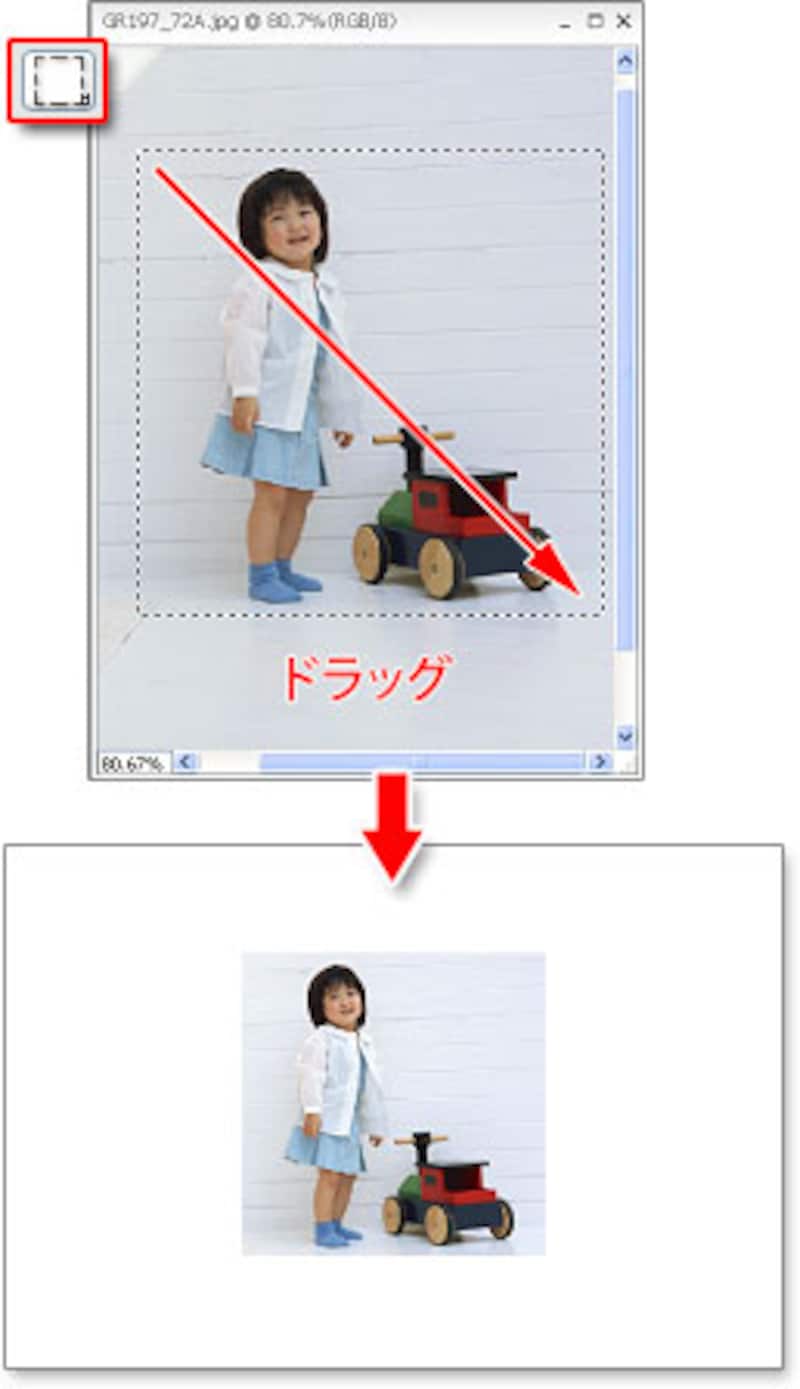 お子さんの写真を[長方形選択ツール]で囲んでドラッグして選択して、[Ctrl]+Cキーでコピーします。