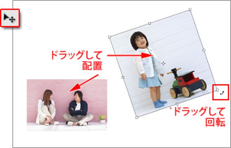[移動ツール]でお子さんを右側、親を左側にドラッグして配置します。お子さんの写真をクリックすると、写真が四角の枠で囲まれます。角の□(ハンドル)の少し外側をドラッグして、写真を回転します。