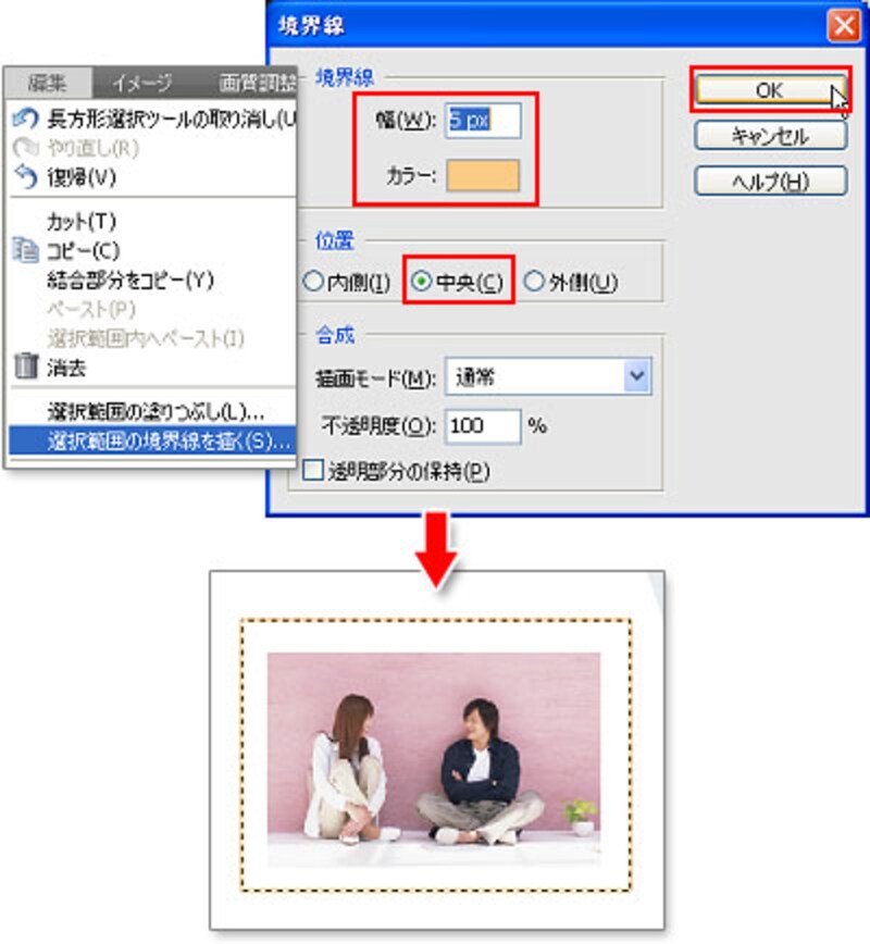 [編集]メニュー→[選択範囲の境界線を描く]を選び、[境界線]で線幅のサイズを入力します。ここでは「5px」に設定しています。[カラー]をクリックして、線の色を設定します。[位置]は[中央]を選択して、[OK]をクリックします。