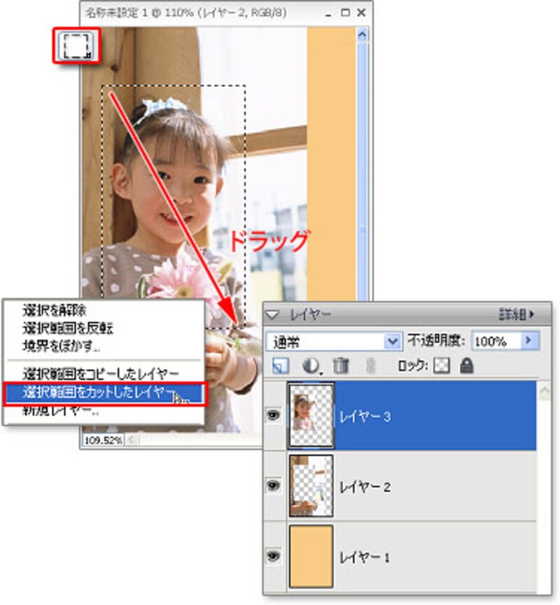 [レイヤー]パレットには、選択した部分だけが切り取られたレイヤー[レイヤー3]が追加されます。