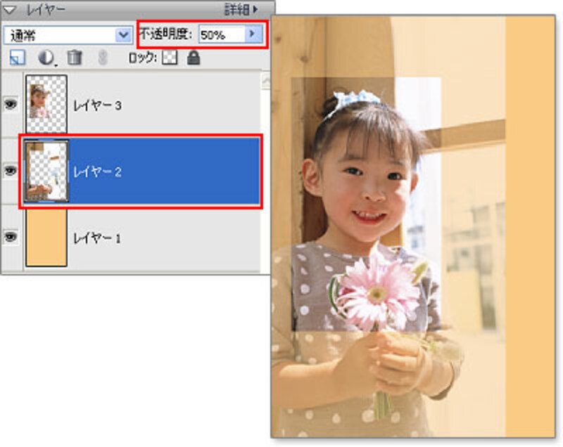 [レイヤー2]を選択して、[不透明度]を「50%」に設定します。顔の周りの写真が半透明になります。