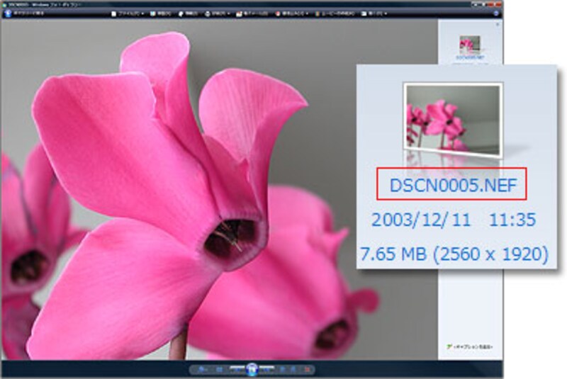 | WindowsフォトギャラリーでRAWファイルをプレビュー。サムネイルをダブルクリックすれば、フルサイズでプレビューすることもできます。 |