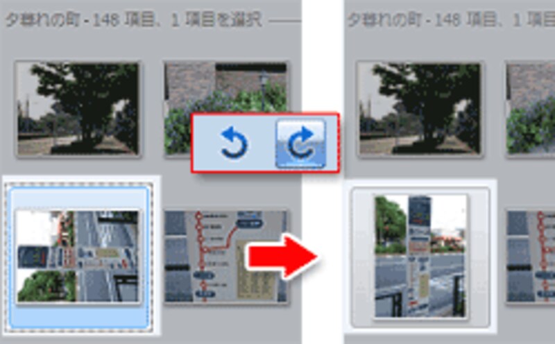 取り込みましたら、縦向きに撮った写真が、横向きのままになっている場合は、[左回りに回転]または[右回りに回転]ボタンをクリックして、写真を縦向きに直しておきましょう。また、暗い写真を明るくしたり、色合いを調整する場合は、[修整]をクリックして行っておきます。