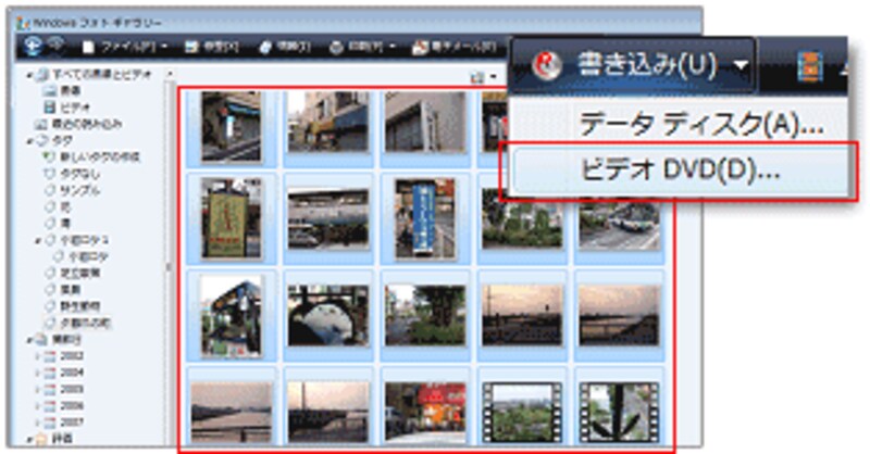 | 写真やビデオも選択して、[ビデオDVD]を選択しています。 |