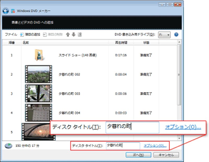 | [ディスクタイトル]に、このDVDのタイトルを入力しましたら、[オプション]をクリックします。 |