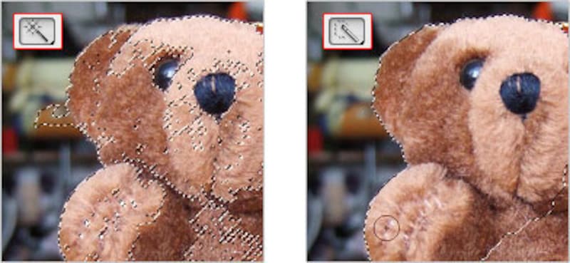 | [自動選択ツール](左図)では、思うように選択できない場合も多々ありましたね…。ところが[クイック選択ツール](右図)では、ドラッグするとみるみる選択範囲が輪郭に吸着して、あっというまにきれいに選択できます! |