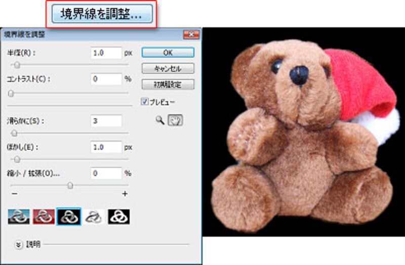 さらに[境界線を調整]ボタンで、選択範囲の境界線を、ぼかしたり、拡大縮小したり。境界がうまく選択できているかどうかを、背景の表示方法を切り替えて確認します。