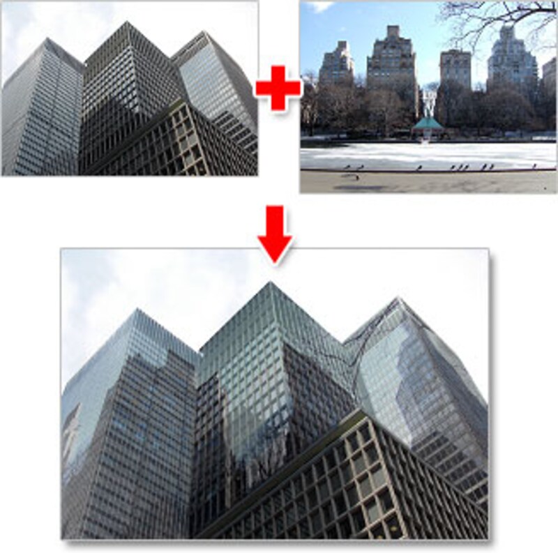 | 左上のビルの側面に、右上の写真を、[Vanishing Point]でパースに合わせて映り込ませます。 |