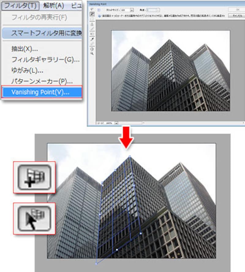 先に映り込ませる写真を開き、全体をコピーしておきます。次にビルの写真を開いて、[ファイル]メニュー→[Vanishing Point]を選びます。