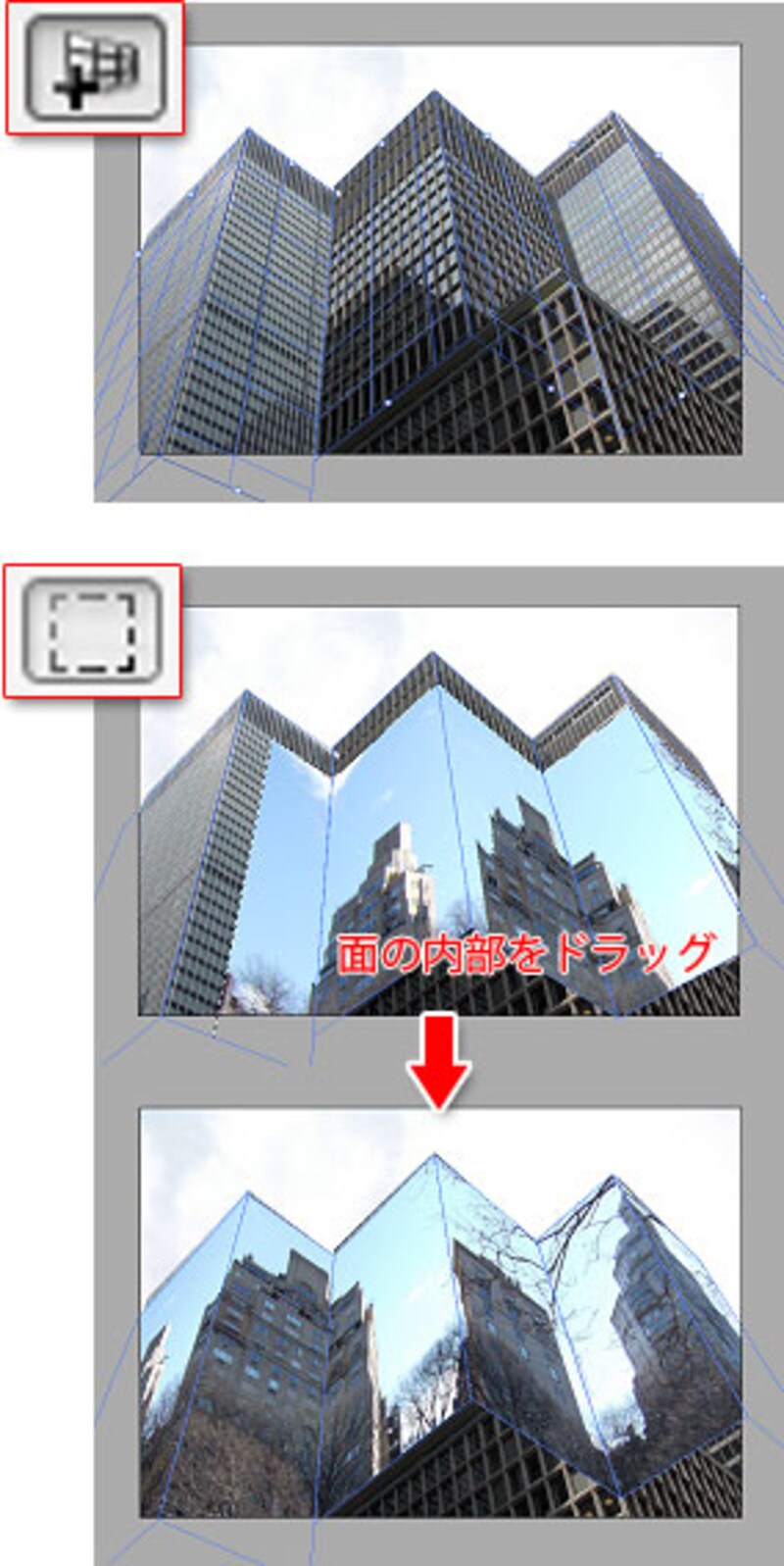 遠近感のある建物やものにも、パースに合わせて画像を貼り付けるツールとしておなじみの[Vanishing Point]が、多面性にも対応しました。たとえば下図のような写真のビル側面に、簡単に遠近感に合わせた映り込みなどを表現できます。