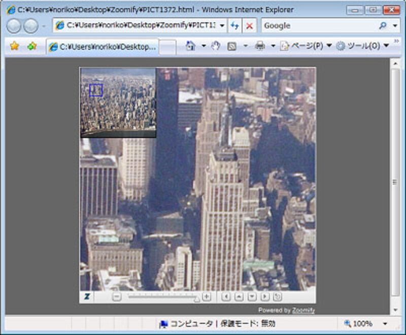 | 書き出されたHTMLドキュメントを、Webブラウザで開いたところです。左上のサムネイルにある青い四角の枠内の画像が、拡大表示されています。 |