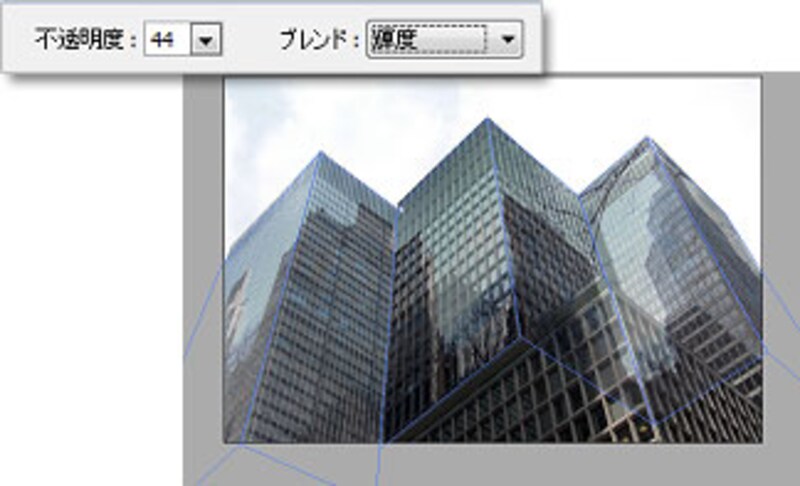 | [選択ツール]を選んだ時のオプションバーで、[ブレンド]および[不透明度]を調整。 |