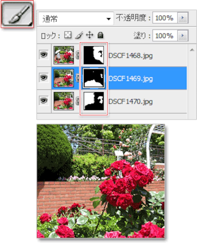 | 上のレイヤーマスクを黒いブラシでドラッグして、右の女性を消し、一番下のマスクを白いブラシでドラッグして、背景を表示させます。さらに中央のマスクを白いブラシでドラッグして、右の男性を消します。 |