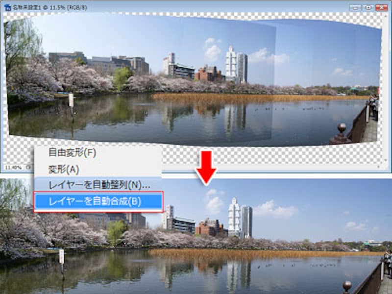 | [レイヤーの自動整列]で配列した写真の不自然なつなぎ目も、[レイヤーの自動合成]できれいに補正。 |