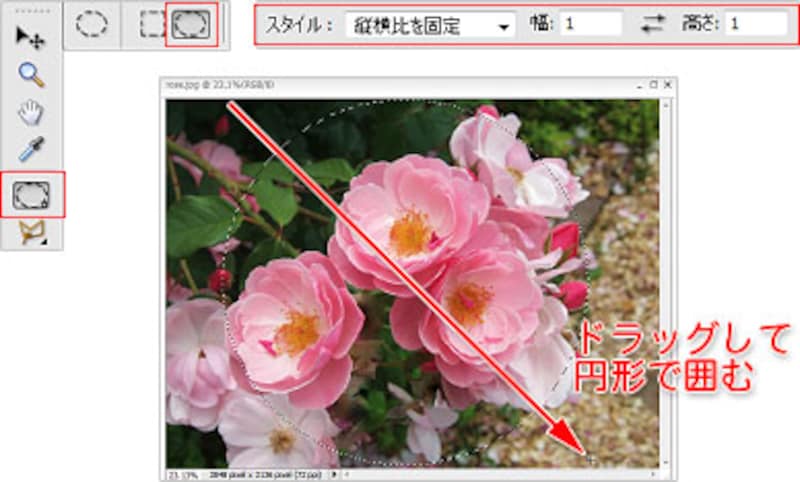 | [楕円形選択ツール]を選び、縦横比1:1の円形で選択しています。 |