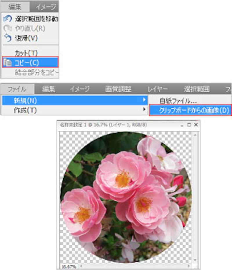 続けて[ファイル]メニュー→[新規]→[クリップボードからの画像]を選びます。