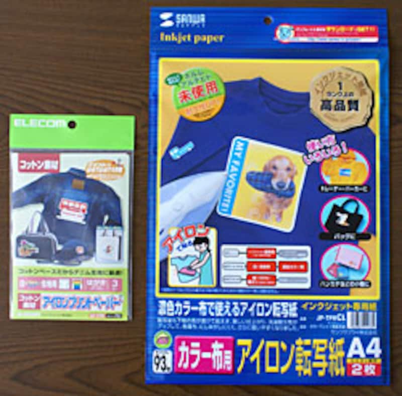 | 【左】エレコム(EJP-CTPH1)はがきサイズ・3枚入・コットン素材・白、カラー生地用 標準価格:504円 【右】サンワサプライ(EJP-CTPH1)A4サイズ・2枚入・白、カラー布用・シリコン紙付き 標準価格:1,554円 |