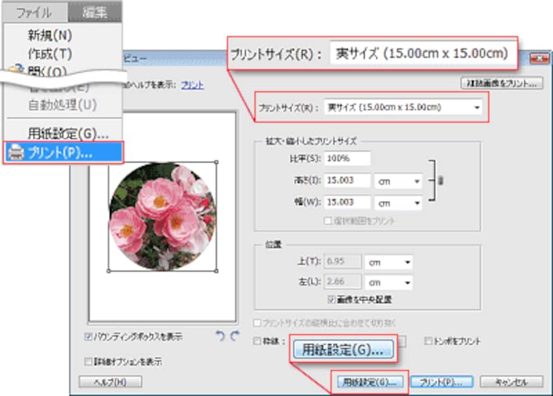 | [プリントサイズ]を[実サイズ]に設定して、[用紙設定]をクリックします。 |