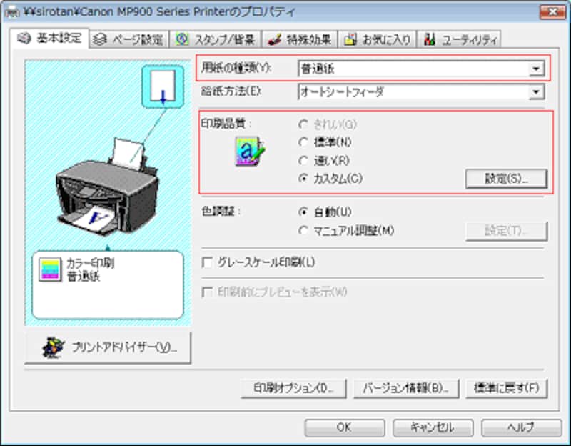 | アイロンプリント用紙の説明書に従って、用紙の種類を[普通紙]に、印刷品質を「高品質」設定にしているところです。 |