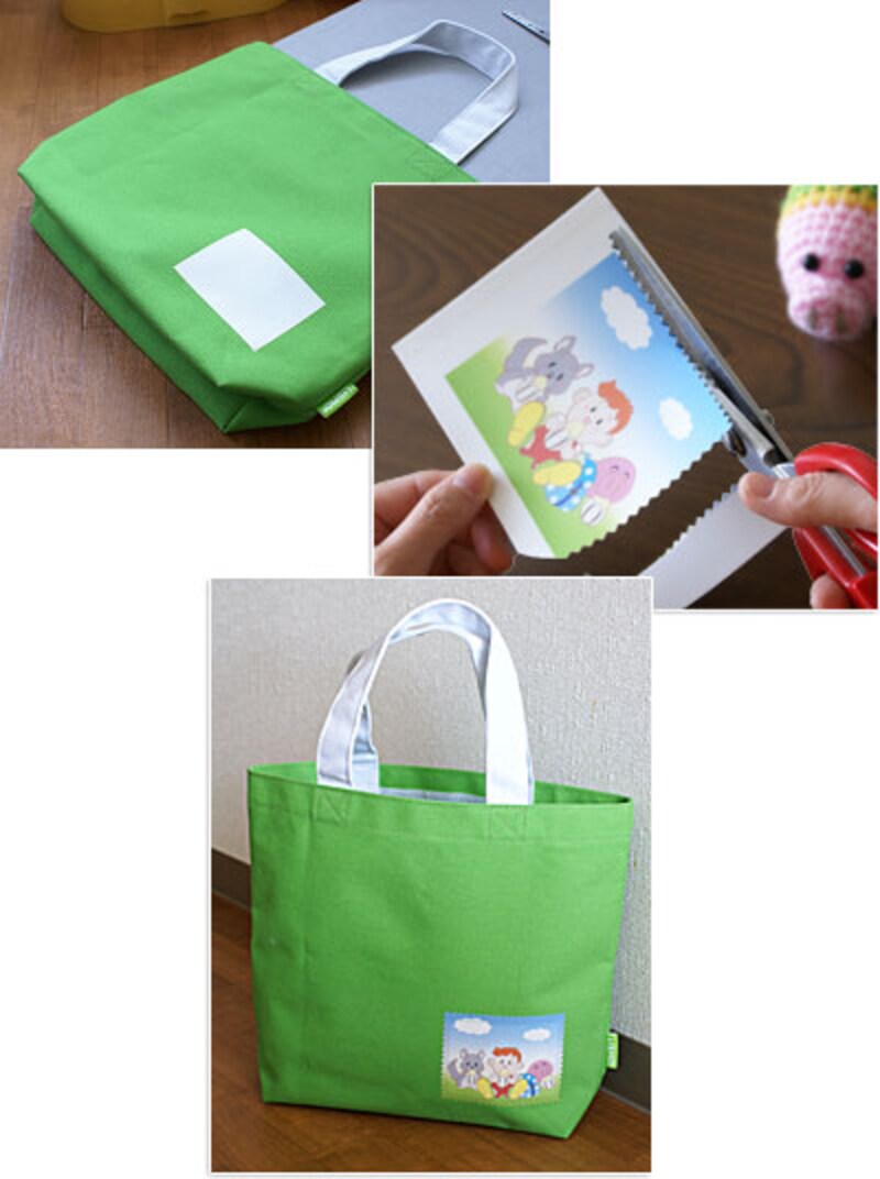 印刷を終えた用紙をはさみで切り取り、エコバッグに貼り付けます。