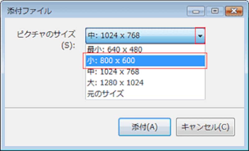 [添付ファイル]設定画面が開きます。ここで[ピクチャのサイズ]の右側にある▼をクリックして、プルダウンリストから、リサイズしたいピクセルサイズを選びます。もしくは適当に選択をします。![]() |