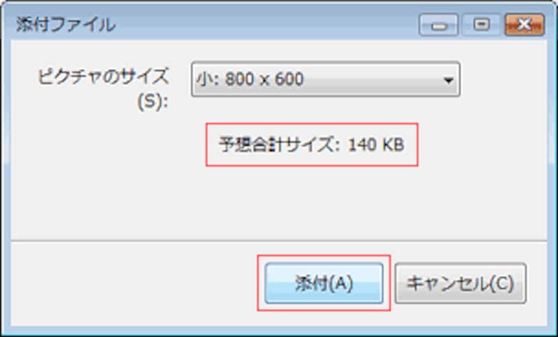すると、[予想合計サイズ:○○KB]というように、リサイズ後のファイルサイズが表示されます。ここを目安にして、目的に近い、もしくは投稿サイトで制限されているサイズよりも小さくなるような、ピクチャサイズを選びます。[添付]をクリックします。