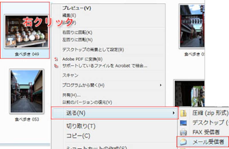 写真を右クリックしてコンテキストメニューから[送る]→[メール受信者]を選びます。