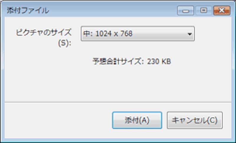 すると[添付ファイル]設定画面が開きますので、あとの操作は、上記で紹介している「ピクチャのサイズを選びます」の項から、同じ方法で行ってください。