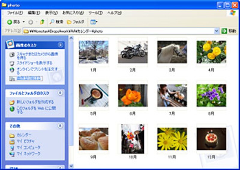 [ピクチャ]フォルダにカレンダー写真用のフォルダを作って、その中に12枚の写真を収納しておきます。