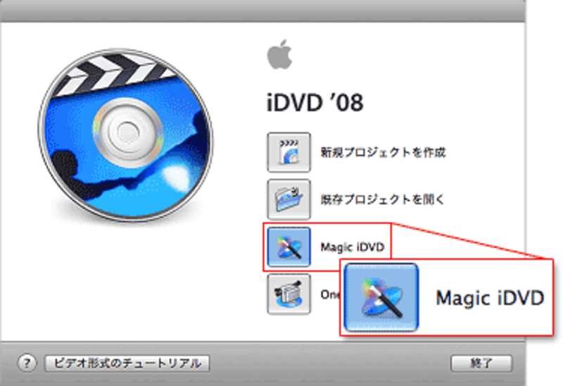 iDVDの「Magic iDVD」を使うと、あっという間にDVDが作れます。[アプリケーション]→[iDVD]をダブルクリックで起動します。