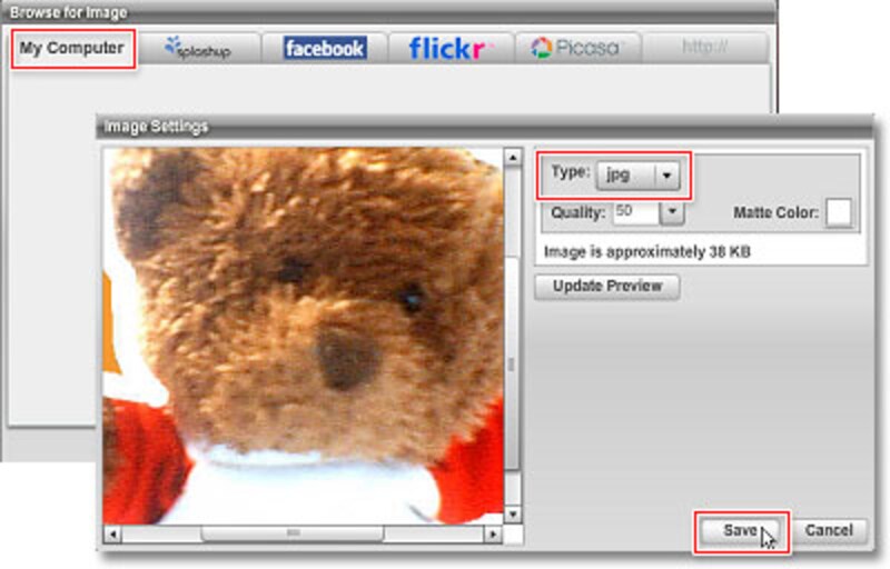 また、現在私の環境では、FlickerやPicasaでの画像の保存、読み込みがうまくいきませんでした。「My Computer」と「Splashup」からの読み込み、保存は可能です。
