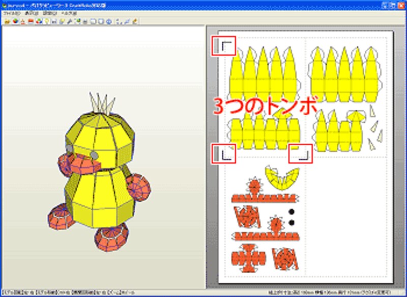 前項で保存した展開図を、CraftROBO対応の展開図作成ビューワーで開き、印刷をします。展開図にはCraftROBOがカットの際に認識する「トンボ」が表示されています。